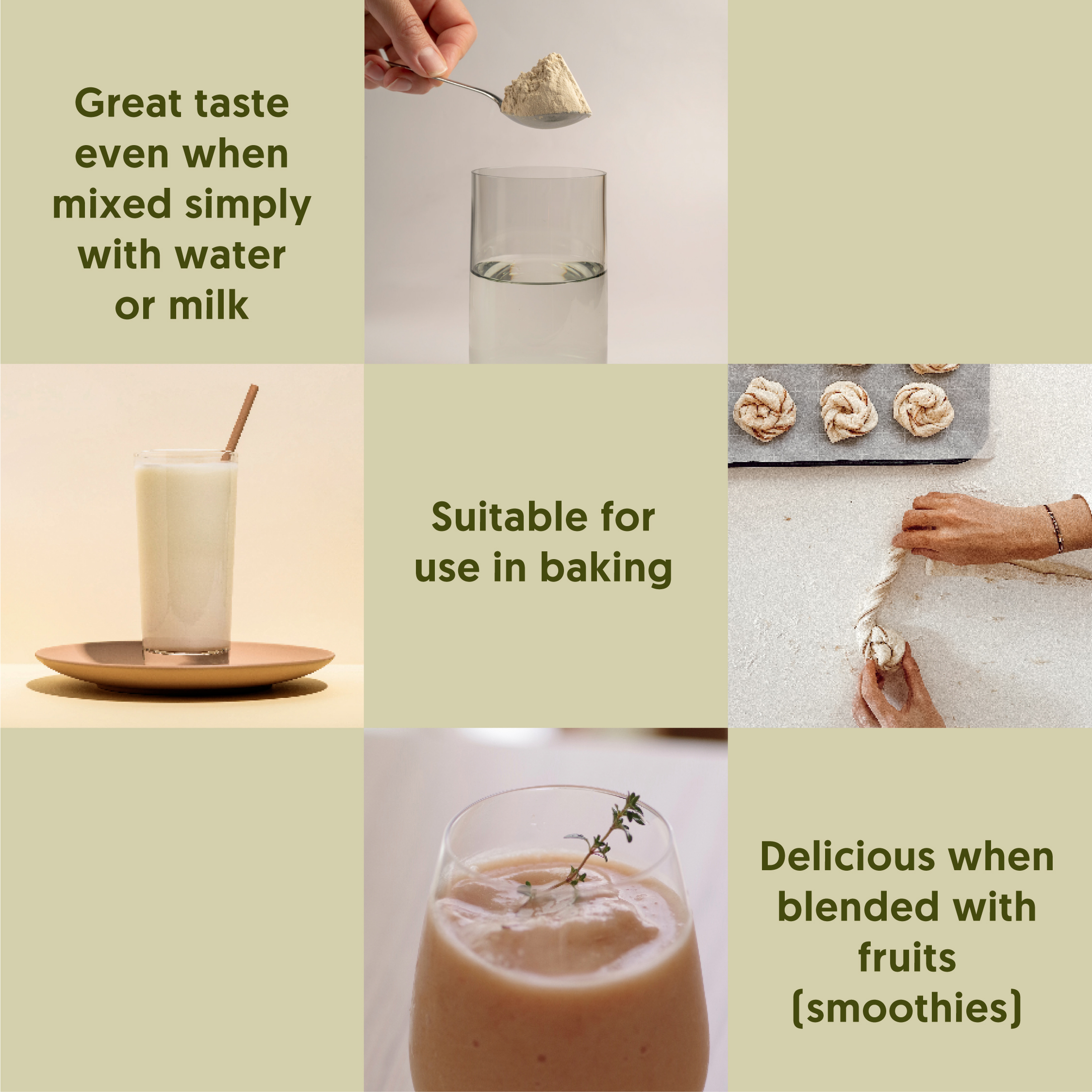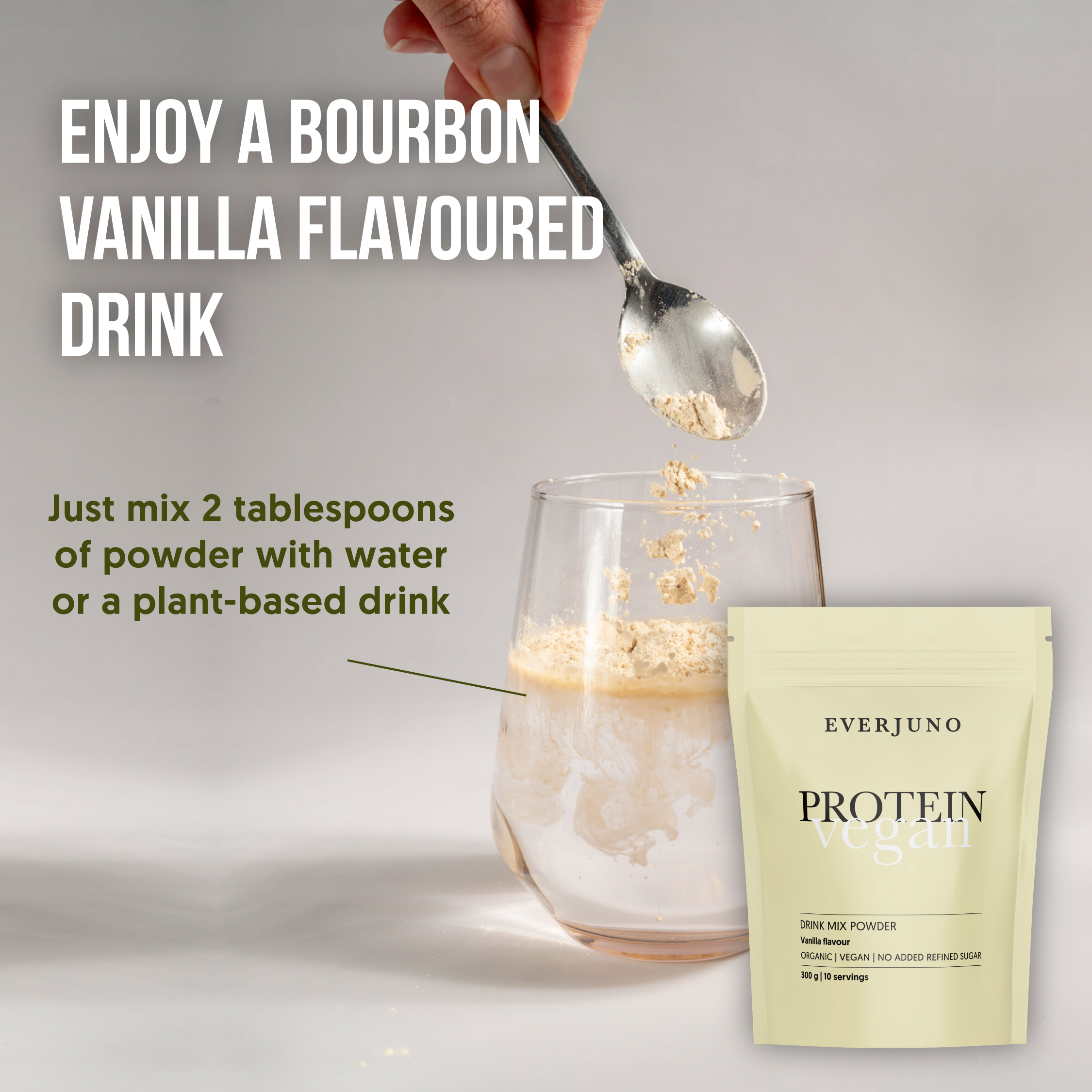 Mix 2 tablespoons (30 g) of powder with 200 ml of plant-based drink or chilled water. Shake it and enjoy a Bourbon vanilla flavoured drink.